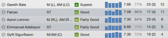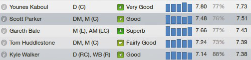 Younes Kaboul show great perfrom so far, and he is on top higher rating in my squad. Scott Parker and Gareth Bale come in 2nd and 3rd