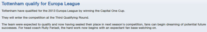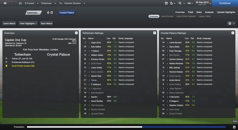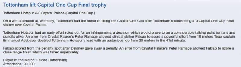 But without having a lot of trouble Tottenham win the Final with convince score 4 - 0, Falcao show his capability with hatrick into Crystal Palace goal.